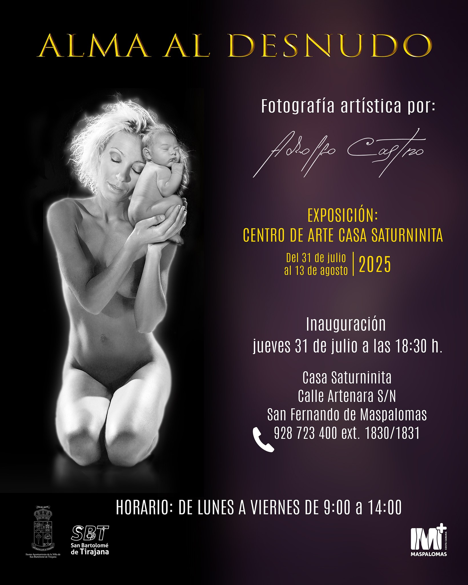La Concejalía de Cultura del Ayuntamiento de San Bartolomé de Tirajana presentó este, 31 de julio, en la Casa Saturninita la exposición fotográfica ‘Alma al desnudo’, del artista colombiano afincado en Gran Canaria, Adolfo Castro. El emotivo acto de inauguración de la muestra reunió a autoridades, artistas y amigos para rendir homenaje a la mirada sensible de un creador que ha sabido capturar el alma a través del cuerpo.
