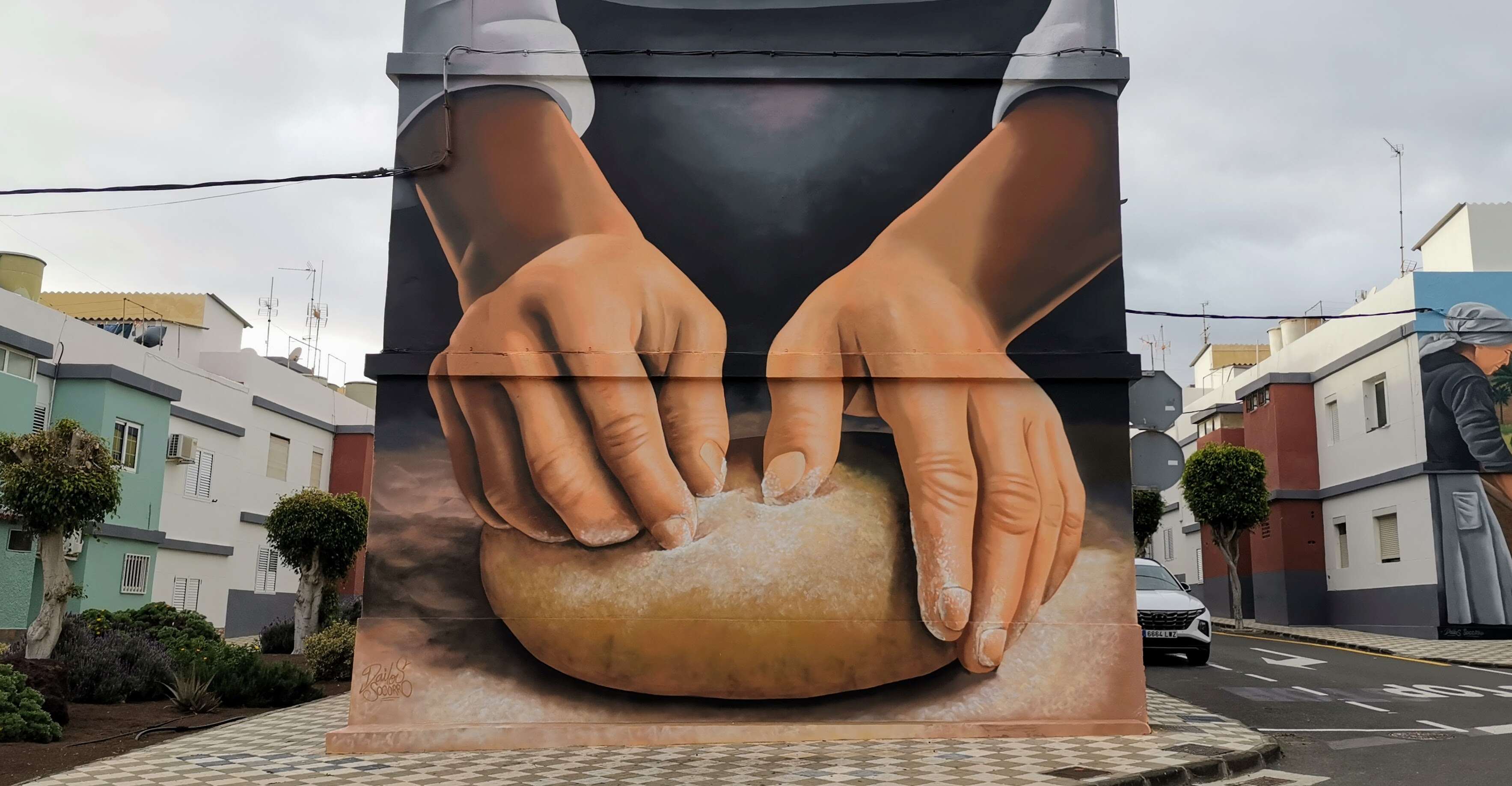 La Avenida Hermanos La Salle luce oficialmente desde este lunes tres murales de grandes dimensiones que rinden homenaje al patrimonio personal y cultural del municipio. Uno de los murales refleja la mirada de dos pares de ojos que podrían parecer anónimos pero que, en realidad, tienen nombre y apellidos. Se trata de los vecinos Lolita Arias y Chano Sánchez, dos de los residentes más longevos y queridos de uno de los edificios sobre cuya fachada lucen ya para la posteridad sus miradas. El segundo mural refleja el amasado del pan, una tradición de gran carga simbólica en Agüimes, mientras que el tercero describe una típica estampa de trabajadores del campo labrando la tierra.