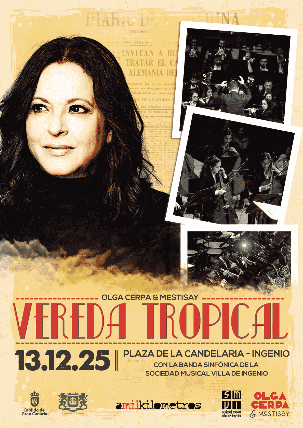 Olga Cerpa y Mestisay presentan en la Plaza de la Candelaria de Ingenio, el día 13 de diciembre, a las 21:00 horas, su espectáculo titulado ‘Vereda Tropical’, inspirado en una afortunada inmersión discográfica de canciones populares latinas y sonidos de las bandas caribeñas bailables de los años 40 y 50 del siglo XX. El respetado combo canario suma en esta producción el protagonismo de más de medio centenar de músicos pertenecientes a la banda de la Sociedad Musical de la Villa de Ingenio que dirige el maestro José Buceta.