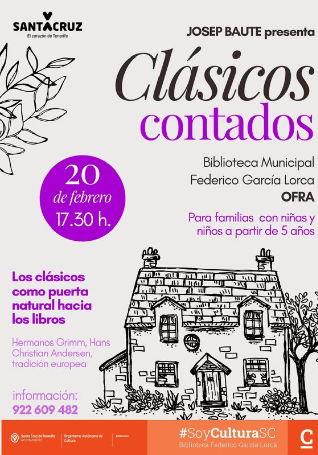 La Biblioteca Municipal Federico García Lorca, ubicada en Ofra, acogerá mañana a las 17:30 horas la sesión “Clásicos Contados”, a cargo de Josep Baute. La actividad consistirá en una narración oral de cuentos clásicos de la literatura universal, con relatos de los Hermanos Grimm, Hans Christian Andersen y la tradición europea, concebidos como puerta de entrada natural al hábito lector. La sesión está dirigida a público infantil mayor de cinco años, así como a público juvenil y familiar.