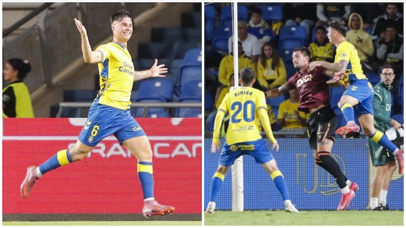 Sergio Barcia celebra su gol tras imponerse de cabeza en la jugada que dio el triunfo a la UD Las Palmas ante el Cádiz, bajo la atenta mirada de Kirian Rodríguez, otro de los grandes protagonistas de la noche. Fuente: LaLiga