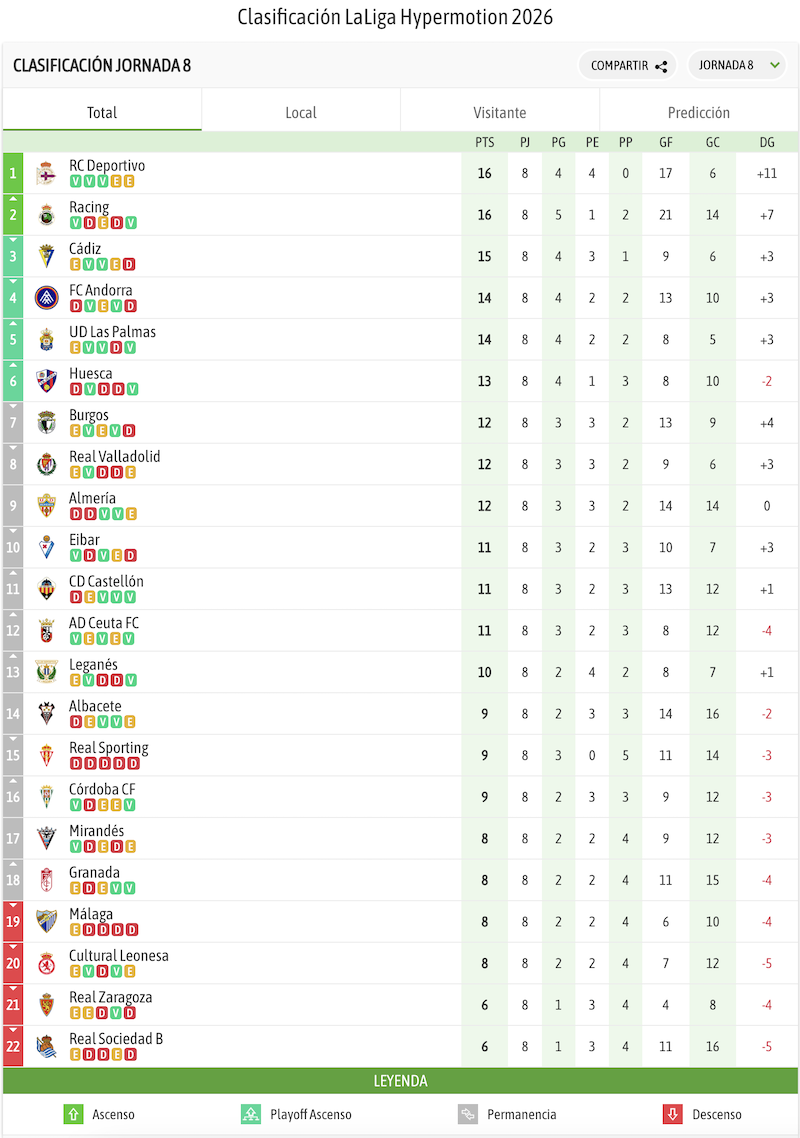Durante septiembre, el conjunto de Pacheta frenó la caída con empates ante Málaga (2-2) y Burgos (1-1), aunque volvió a caer en casa frente al Leganés (0-2). Esa falta de continuidad y la fragilidad en su estadio explican por qué sigue fuera de la zona de privilegio.