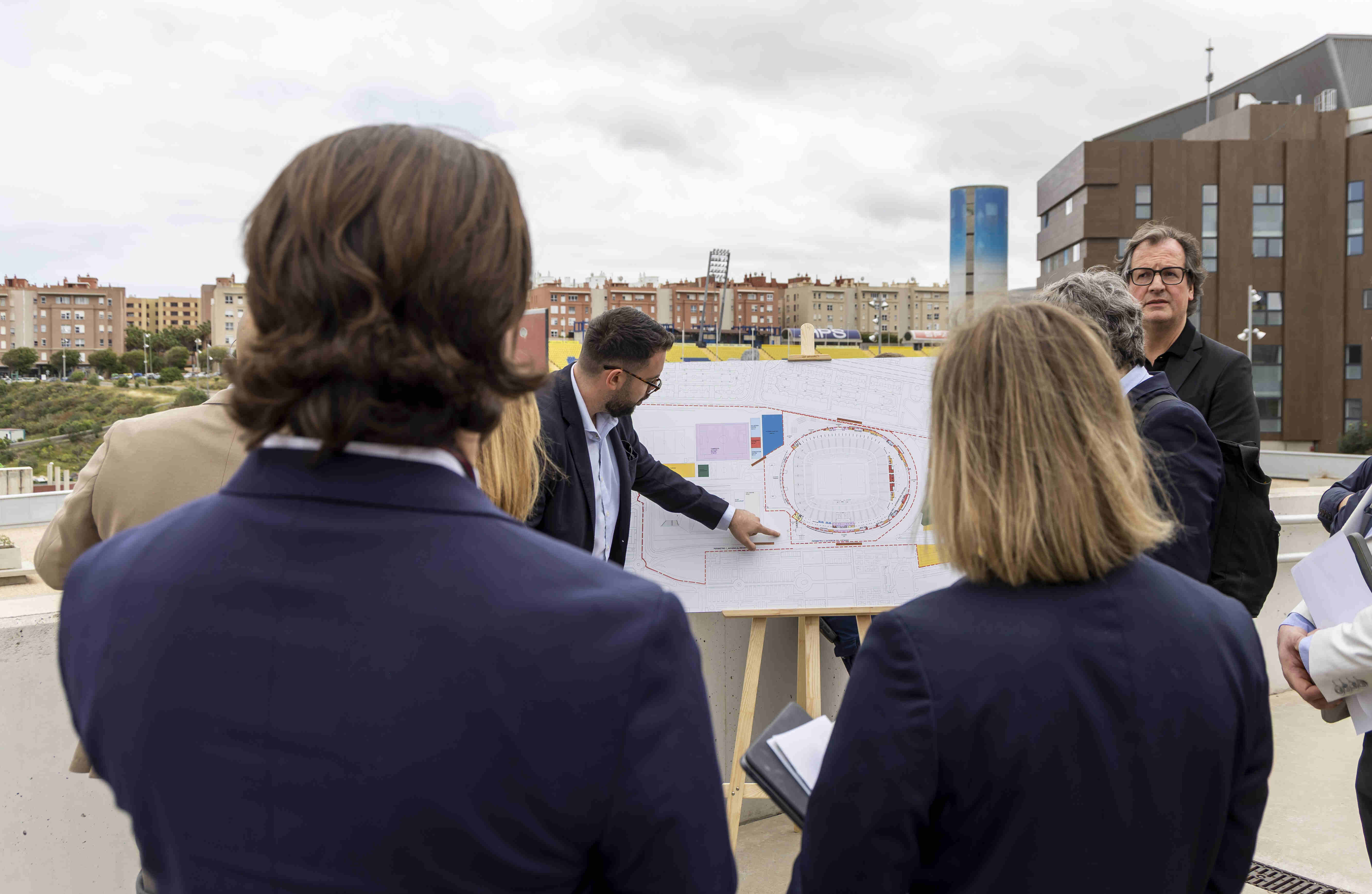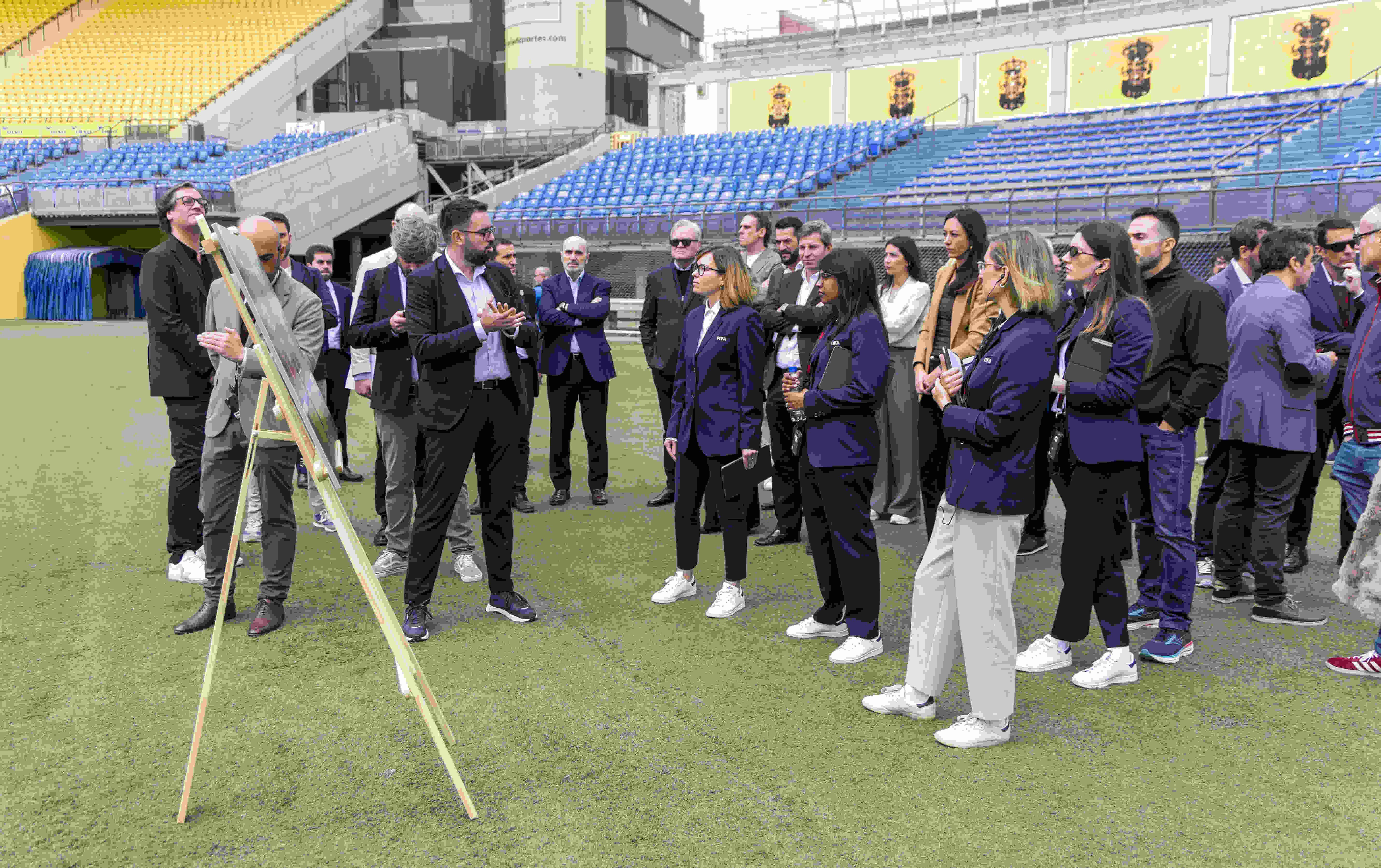 Posteriormente el grupo realizó una visita al Estadio de Gran Canaria y sus alrededores, donde pudieron comprobar in situ el inicio de las obras de demolición de la torre este, ya en ejecución. Durante el trayecto, el jefe del servicio de Arquitectura del Instituto Insular, Ricardo Pereira Pérez de los Cobos, guio a los delegados de la FIFA por los entresijos de la Ciudad Deportiva Siete Palmas y del Estadio Insular, con paradas en puntos estratégicos para explicar cuestiones relacionadas con la seguridad, la sostenibilidad, accesos, aparcamientos, césped y zonas vip. El trayecto finalizó en el centro del campo, en el que pudieron observar gracias a unas gafas especiales Vr y 3D que ofrecen una experiencia inmersiva de realidad virtual y a través de las cuales pudieron disfrutar de una experiencia única: ver el Estadio de Gran Canaria finalizado, transformado en La Nube.