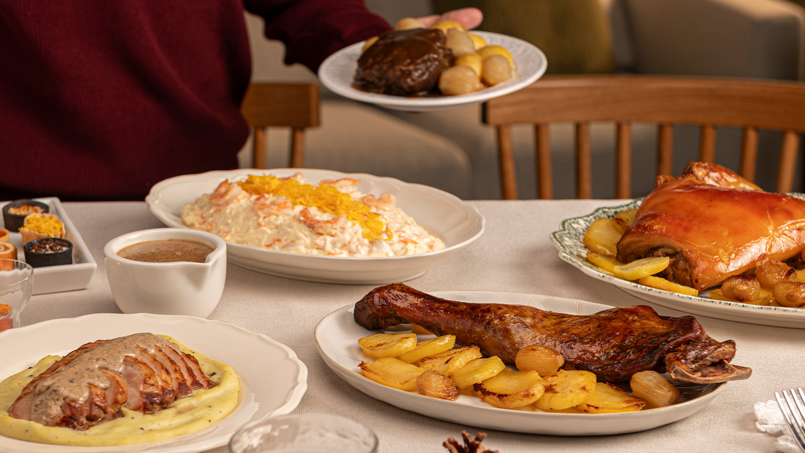 Completan el surtido navideño los platos calientes, compuesto por el muslo de pollo relleno de carne picada de pollo, ciruelas, foie, chalotas, panceta y trufa, acompañado de puré de patata trufado; la carrillada guisada con patatas asadas y cebollitas confitadas; la paletilla de cordero lechal con patatas panaderas y cebollitas confitadas; y un cuarto de cochinill.