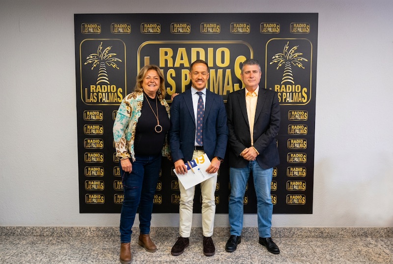 Dulce María Facundo, Mariano Hernández Zapata, consejero de Transición Ecológica y Energía del Gobierno de Canarias, y Héctor Cabezas, director de Radio Las Palmas, posan en el photocall de la emisora tras la entrevista en «Buenos días a las 8».