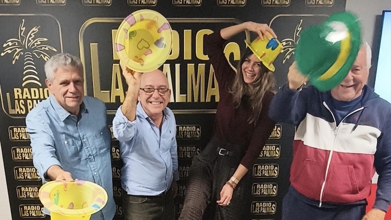 De izquierda a derecha, Alejandro García, Juan Carlos Jiménez, Carmen Murias y Roque Díaz posan tras finalizar el programa Dcultura y Salud, manteniendo el ánimo festivo y carnavalero en el photocall de Radio Las Palmas, con el Carnaval aún muy presente.