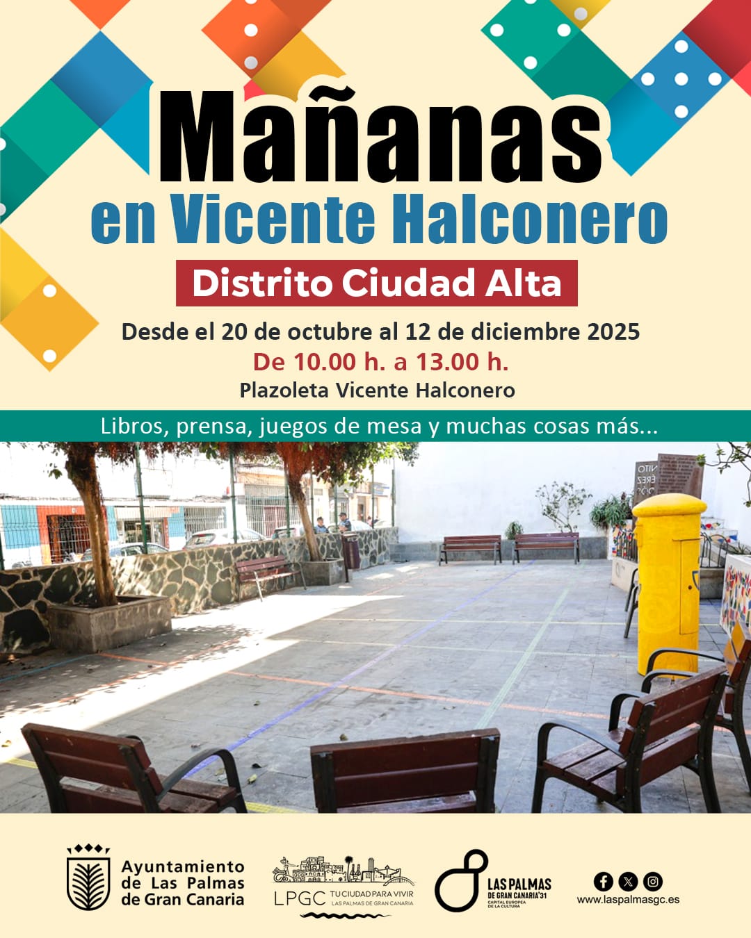El Ayuntamiento de Las Palmas de Gran Canaria, a través del Distrito de Ciudad Alta, pondrá en marcha el próximo lunes, 20 de octubre, el programa 'Mañanas en Vicente Halconero', una propuesta de ocio y encuentro dirigida a las personas mayores del distrito.