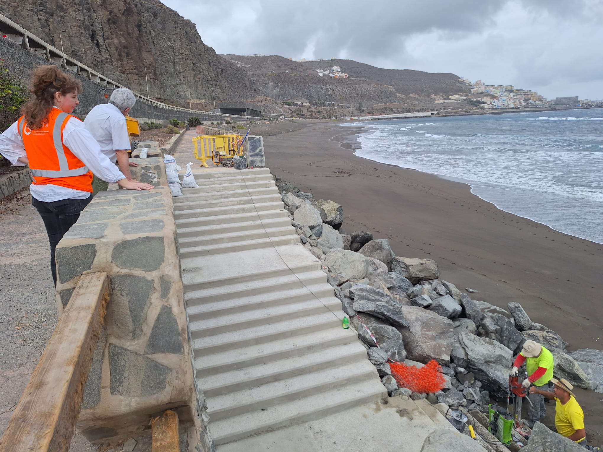 El concejal de Ciudad de Mar, Pedro Quevedo, junto con técnicos municipales de Ciudad de Mar y Planificación y Desarrollo Urbano, han supervisado este jueves el estado de las obras de mejora de la accesibilidad que el Ayuntamiento de Las Palmas de Gran Canaria realiza en la playa de La Laja. La actuación, que alcanza ya el 50% de ejecución, avanza conforme al plazo previsto y se prevé finalizar el próximo diciembre.