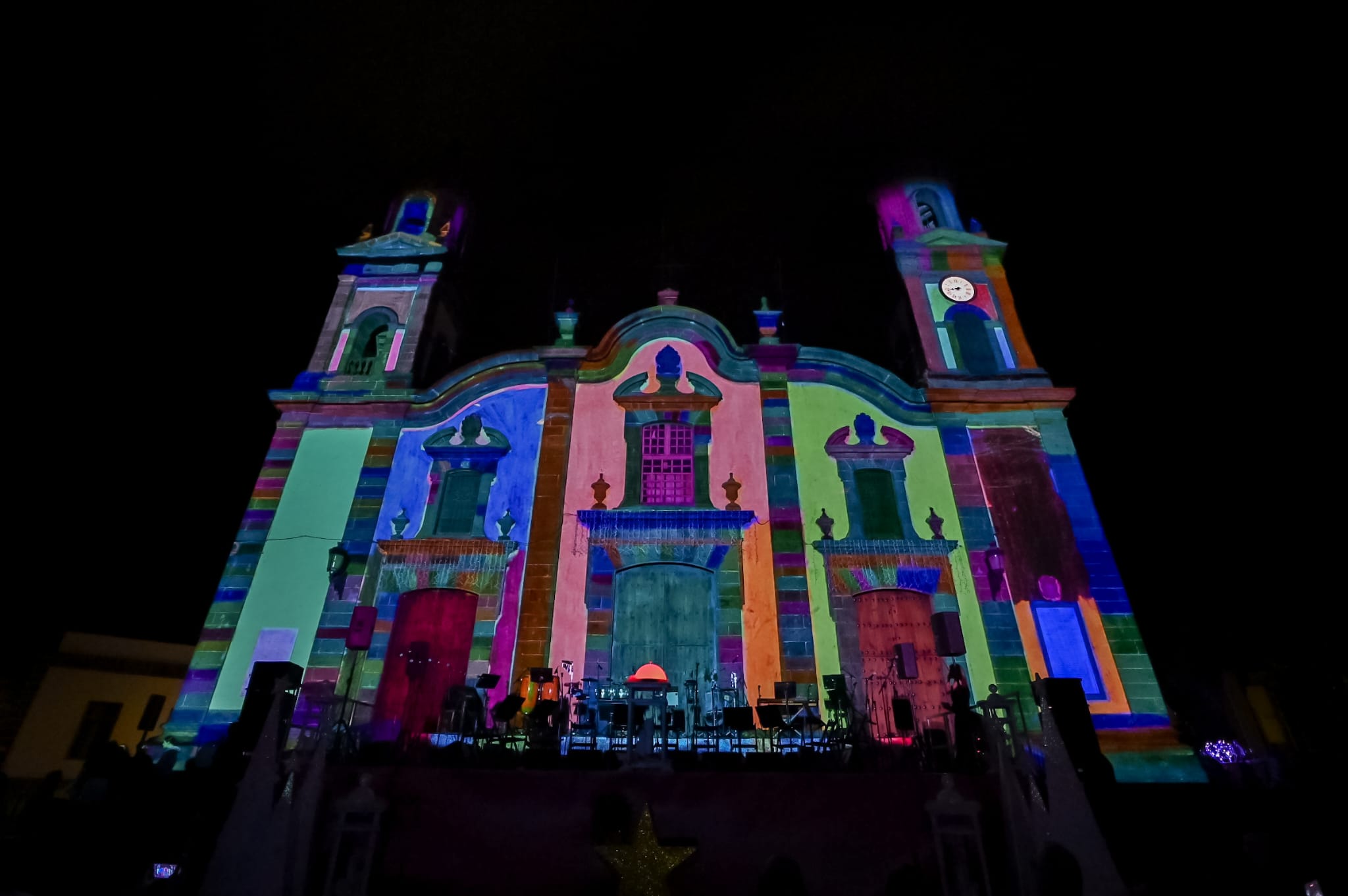 La noche festiva comenzó con un espectáculo visual y sonoro que transformó por completo el frontis del templo matriz y lo convirtió en un lienzo vivo. La proyección llevó al público por un viaje inmersivo a lo largo de los 500 años de historia de la Ciudad, con un recorrido por las raíces que han dado forma a Guía, por su cultura, sus oficios, sus tradiciones y el valioso patrimonio histórico, artístico y social que define su identidad.