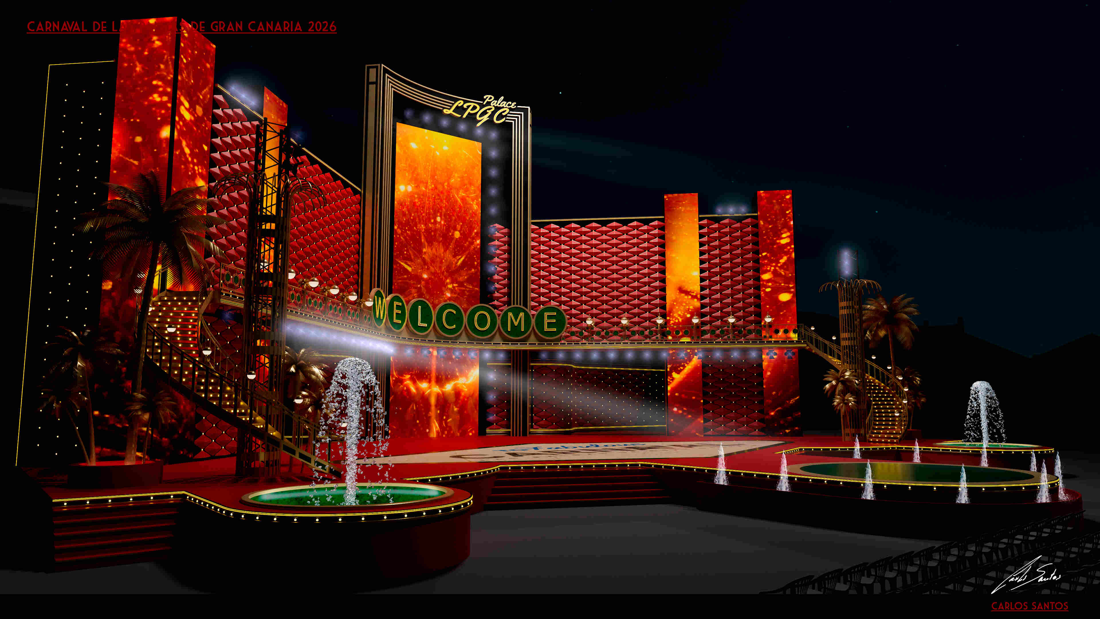 El escenario del Carnaval se convertirá en un espacio de bienvenida a las Carnestolendas en la edición en que cumplen medio siglo de vida desde su recuperación. Inspirado en el icónico cartel “Welcome to fabolous Las Vegas”, el recinto del parque Santa Catalina se transforma en «Bienvenidos al Hotel LPGC Palace», en una escenografía ideada por Carlos Santos y que reproduce los elementos del inolvidable neón en el hall de un hotel directamente conectado con el espectáculo y la fiesta.