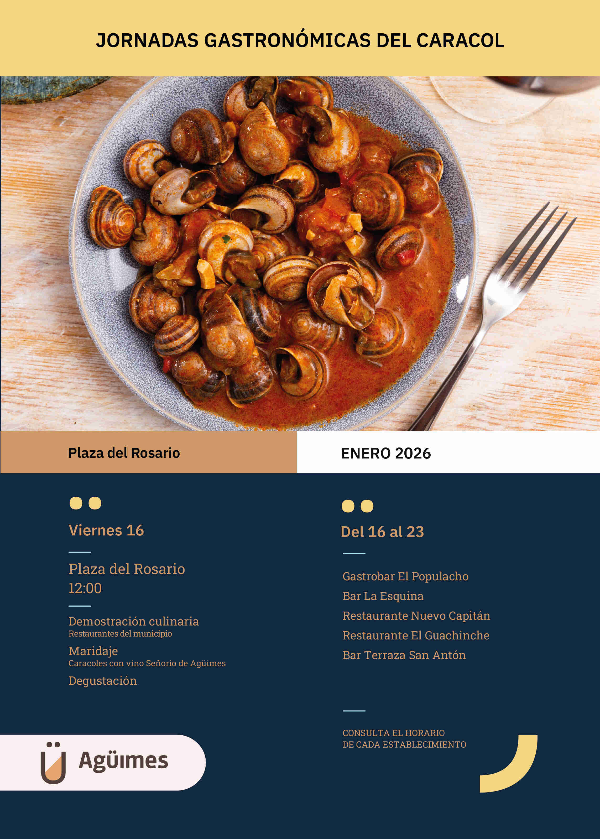 Las Jornadas Gastronómicas del Caracol vuelven este viernes 16 de enero al casco de Agüimes, con una degustación y demostración culinaria. Será a las 12:00 en la plaza del Rosario, donde los asistentes podrán probar algunas de las recetas de los cinco establecimientos de restauración del municipio que participan en esta cita, que se extenderá hasta el próximo 23 de enero.