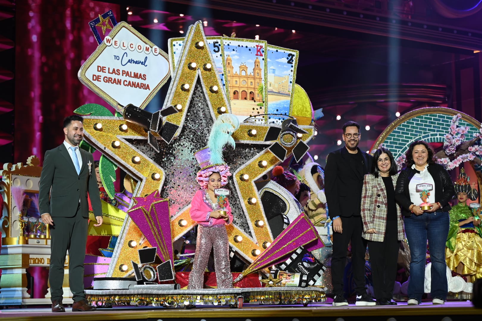 La tarde comenzó a las 19:00 horas con un parque Santa Catalina lleno hasta el extremo y con la emisión en directo a través de Radio Televisión Canaria. En pantalla, unos niños debatían sobre posibles destinos y sus icónicos emblemas, hasta que la madre recordó que, en Las Vegas, descubrirlos era también posible. Ellos eran Alexia Rodríguez, Nicole Jiménez y Ancor Trujillo, tres conductores para una gala. Rodríguez, siempre solvente en escena, orientaba a los dos pequeños presentadores que fueron escogidos en un casting infantil.