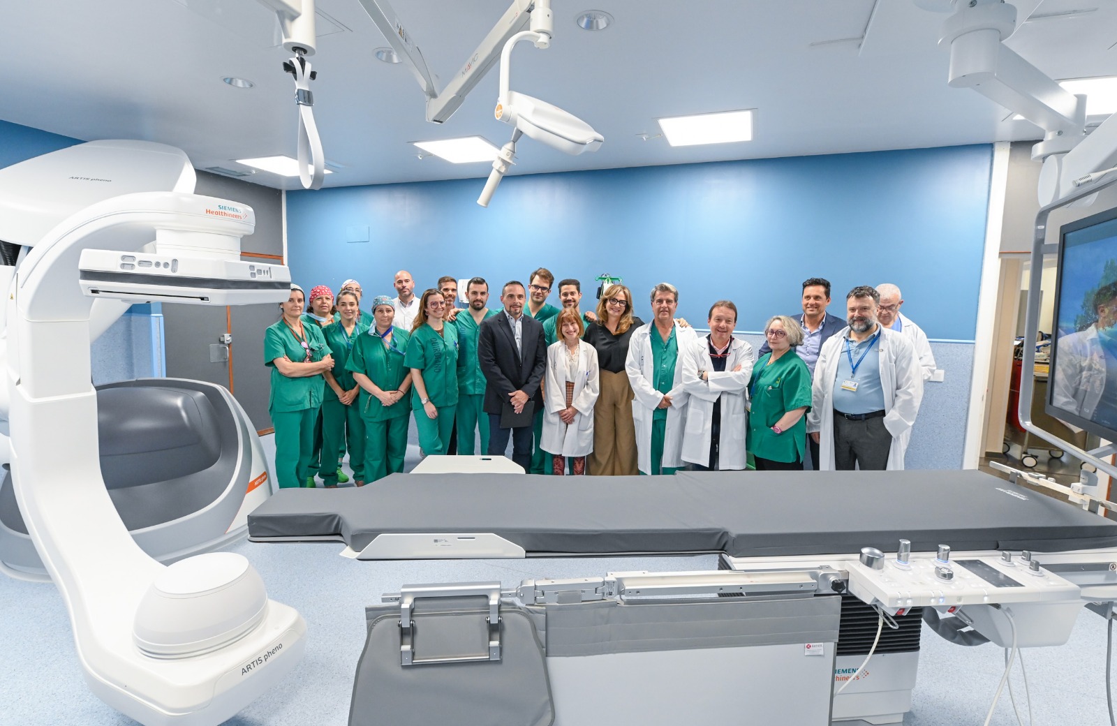 Este equipamiento cuenta con un sistema Siemens ARTIS pheno diseñado para procedimientos mínimamente invasivos y que combina precisión, flexibilidad y eficiencia. Este sistema utiliza un brazo-C robotizado montado en el suelo, lo que libera el techo y facilita el flujo de aire estéril en la sala. El brazo robótico, con múltiples grados de libertad, permite posicionar el equipo con gran precisión alrededor del paciente para obtener imágenes en 2D y 3D de alta calidad, desde casi cualquier ángulo, con posibilidad de visualizar grandes zonas anatómicas con detalle.