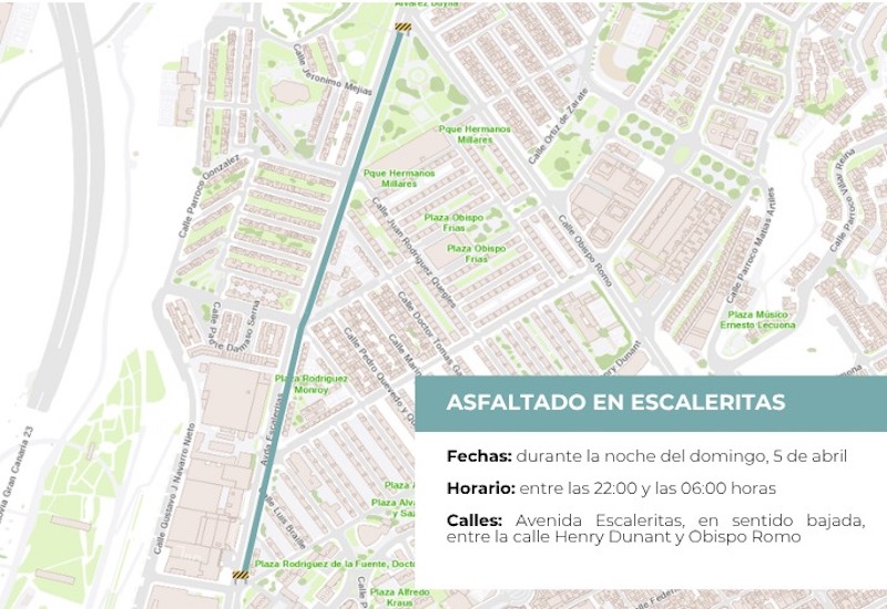 Plano del tramo de la avenida Escaleritas afectado por los trabajos de asfaltado, con corte nocturno de tráfico entre Henry Dunant y Obispo Romo.