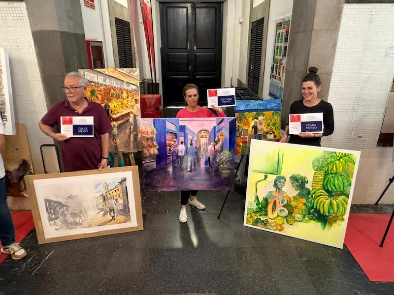 Los ganadores del concurso de pintura rápida posan con sus obras tras el fallo del jurado en el entorno del Mercado de Vegueta, una de las actividades con mayor participación del evento.