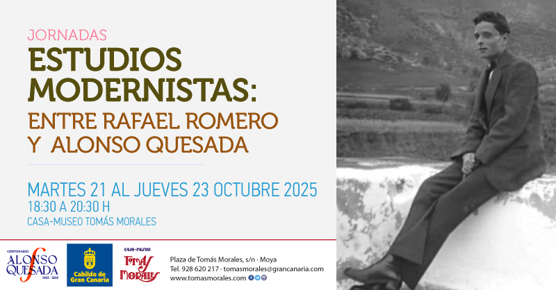 La Casa-Museo Tomás Morales de Moya acoge, del 21 al 23 de octubre, las jornadas 'Estudios modernistas: entre Rafael Romero y Alonso Quesada', que se incluye en la programación impulsada por la Consejería de Cultura con motivo del centenario del citado autor. En ellas se analizarán las diversas etapas artísticas de Quesada, así como de autores coetáneos y el contexto histórico y literario que vivió. Las jornadas tendrán lugar en un horario de 18:30 a 20:30 horas.