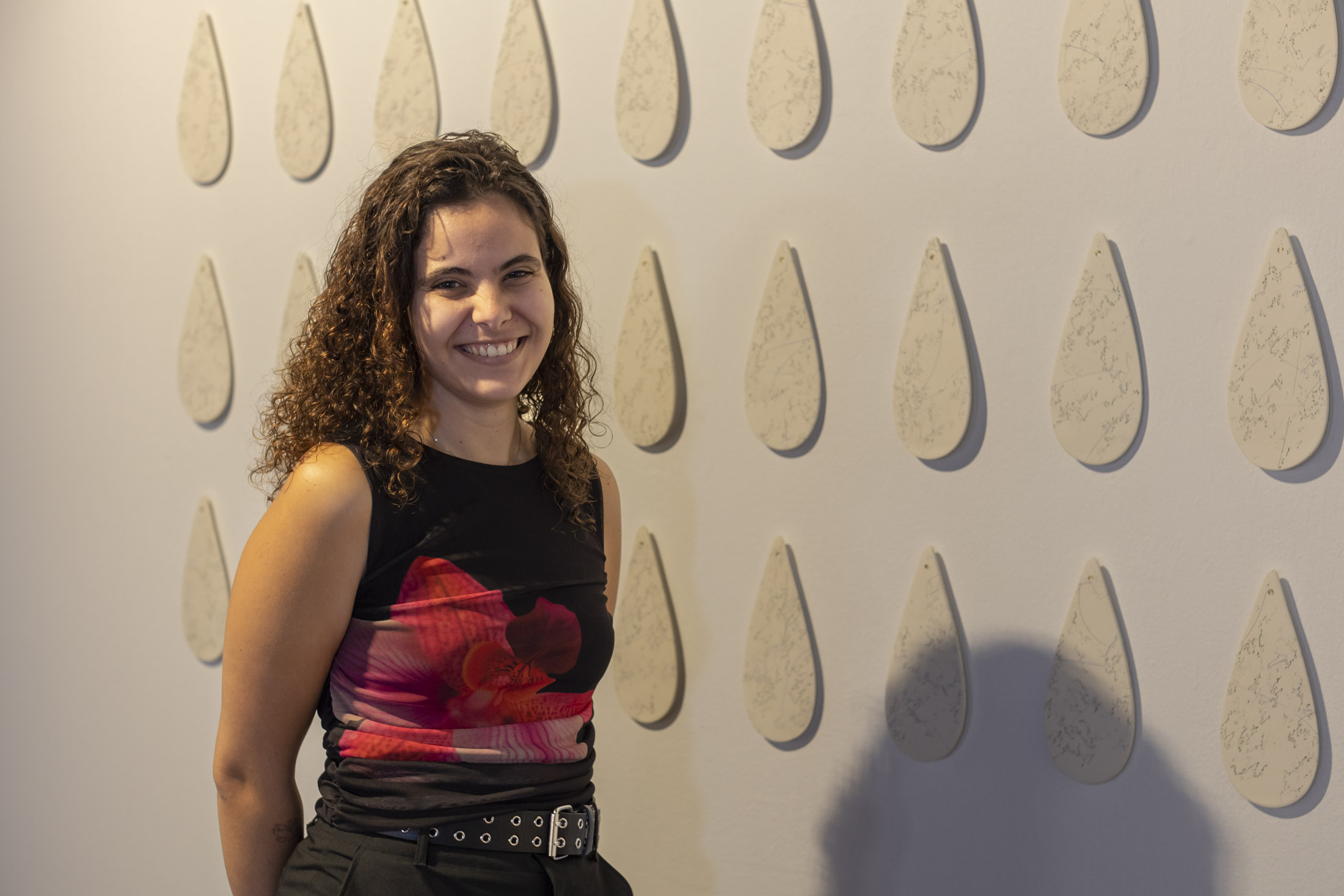 Sisas, cuellos y tiros es el título de la instalación escultórica que presenta la artista Cristina Ortega (Santa Lucía de Tirajana, 1999), compuesta por 40 piezas de arcilla blanca modeladas a mano alineadas sobre pared, recreando un taller de costura.