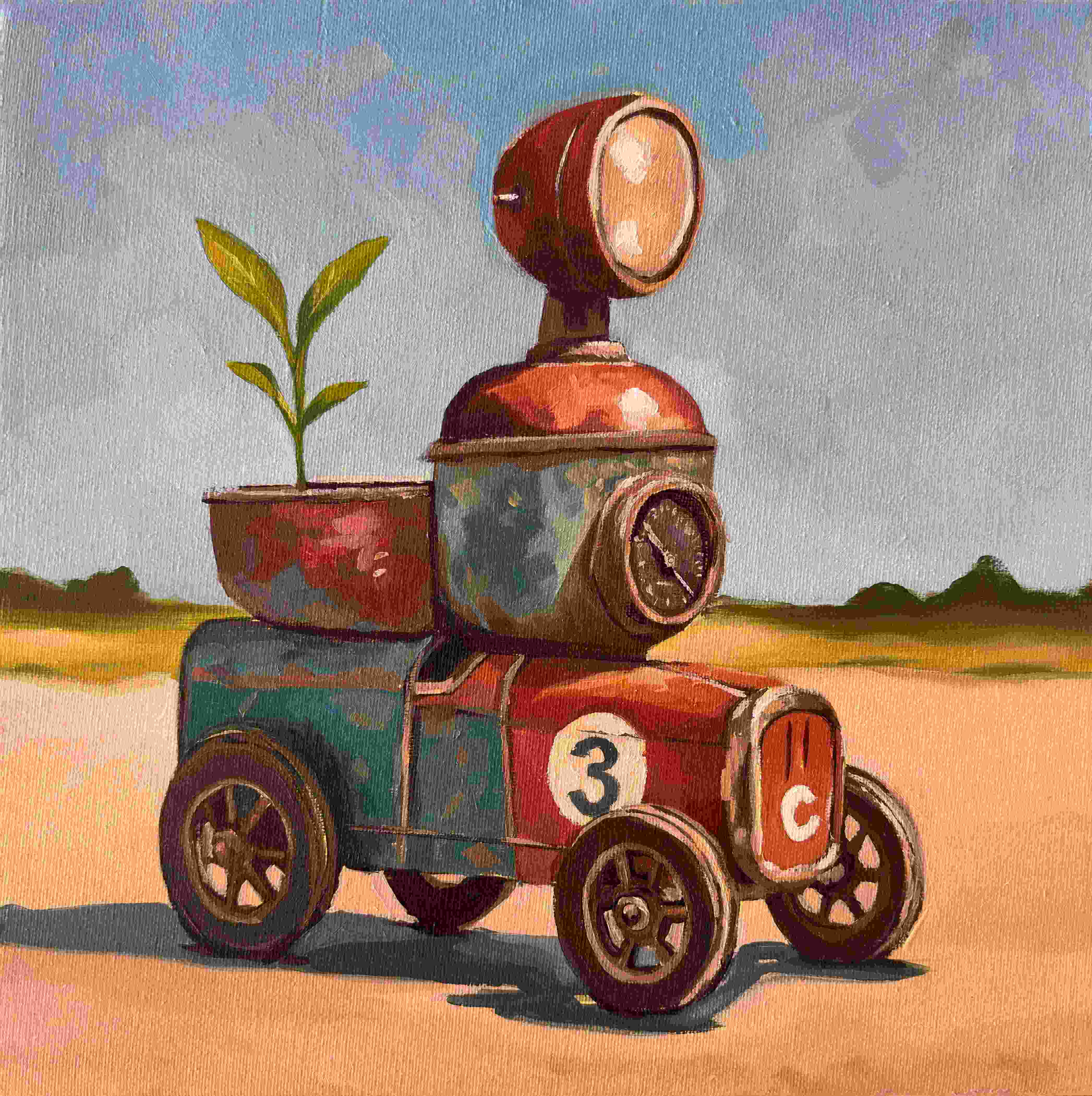 La también muralista e ilustradora desarrolla su trabajo en el cruce entre lo orgánico y lo mecánico, explorando la interacción entre la naturaleza, la ingeniería y la memoria de los objetos. A través de la fusión y descontextualización de piezas antiguas, crea artefactos de conciencia: vehículos imposibles, máquinas poéticas y dispositivos simbólicos que invitan a imaginar nuevas formas de habitar el mundo. Los artefactos que ahora presenta en el Centro de Artes Plásticas del Cabildo grancanario desafían la lógica convencional y proponen una realidad donde la ingeniería, la naturaleza y la preservación de la vida trabajan en sincronía.
