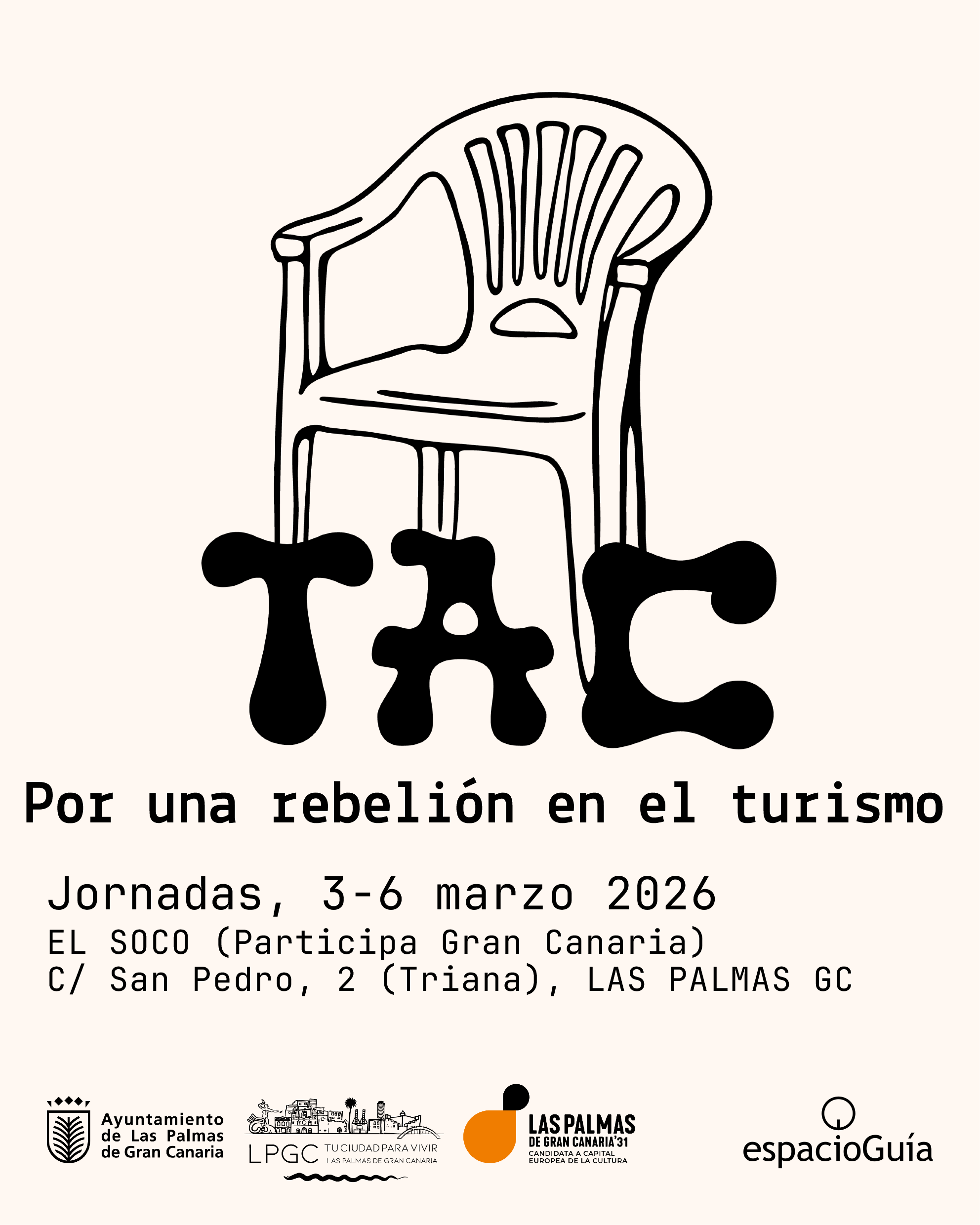 El colectivo de creación cultural espacioGuía presenta las primeras jornadas dedicadas al concepto de Turismo Activo-Cultural (TAC) bajo el título 'Por una rebelión en el turismo', una iniciativa que busca replantear los modelos de gestión turística desde una perspectiva crítica, participativa y arraigada en el territorio. El proyecto, impulsado por la plataforma grancanaria que lideran los creadores Fernando Maseda y Manena Juan, cuenta con el respaldo del Ayuntamiento de Las Palmas de Gran Canaria a través de su Candidatura a Capital Europea de la Cultura 2031.