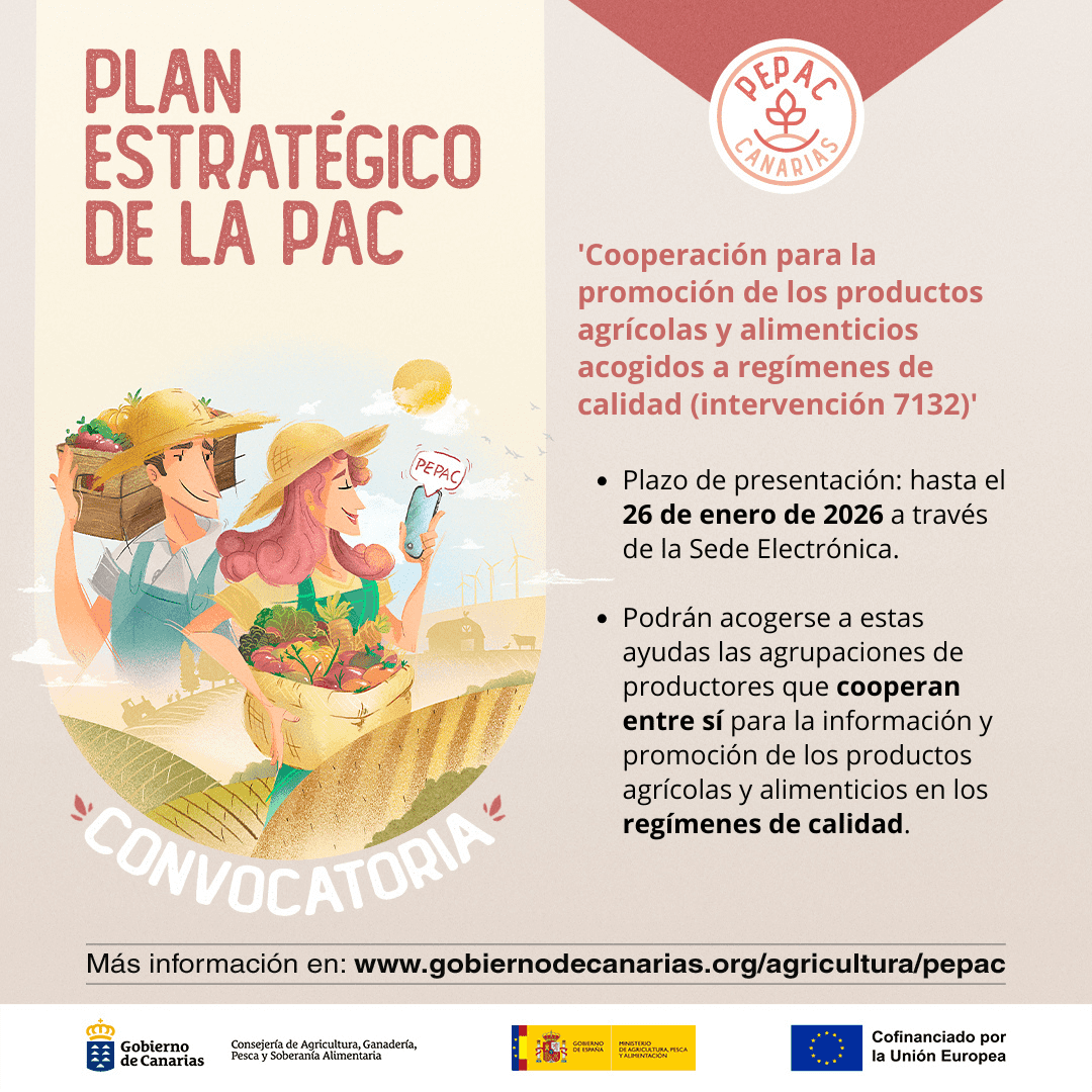 La Consejería de Agricultura, Ganadería, Pesca y Soberanía Alimentaria, a través del Instituto Canario de Calidad Agroalimentaria (ICCA) ha convocado las subvenciones destinadas a acciones de cooperación para la promoción de los productos agrícolas y alimenticios acogidos a regímenes de calidad (intervención 7132), de manera anticipada para 2026, en el marco del Plan Estratégico de la Política Agraria Común (PEPAC) 2023-2027.