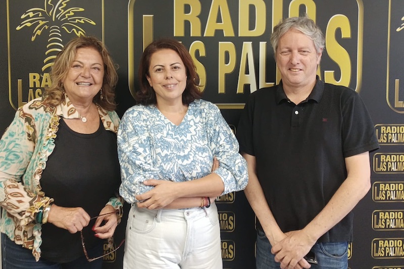 Dulce María Facundo, Minerva Alonso y Eric Santana posan en el photocall de Radio Las Palmas tras la entrevista, donde destacaron la apuesta por un modelo de gestión propio para impulsar la modernización de El Sebadal.