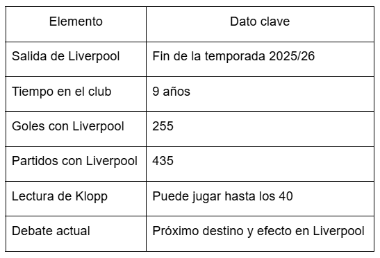 La cuestión de su marcha se ha convertido en uno de los temas más comentados en torno al club, lo que también pone de relieve el impacto de su paso por el Liverpool y la relevancia que adquiere este debate de cara a la próxima temporada.