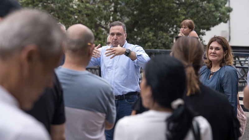 Carlos Ester conversa con los vecinos de Las Torres durante la visita al barrio, acompañado por la portavoz municipal Jimena Delgado, que sigue con atención sus explicaciones sobre la modificación del planeamiento urbano.