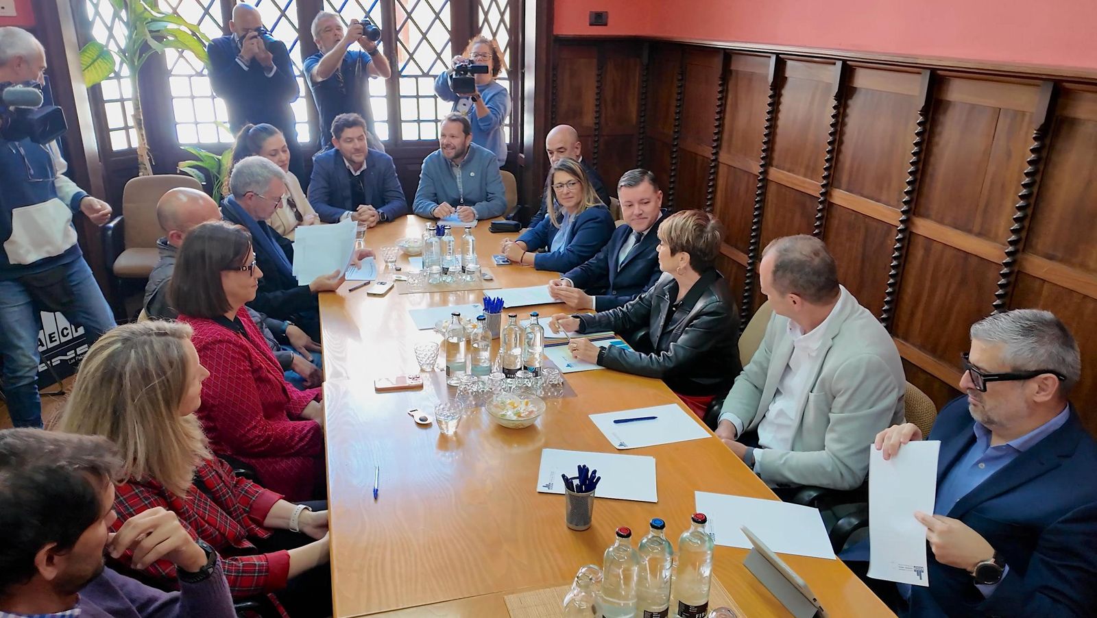Los líderes de Municipalistas Primero Canarias, Teodoro Sosa y Óscar Hernández, acompañados de la vicepresidenta de esta formación política, Vanesa Martín, se reunieron este jueves con una amplia representación de los sectores empresariales y profesionales vinculados a la vivienda en Canarias. Al encuentro asistieron el decano del Colegio Oficial de Arquitectos de Gran Canaria (COAGC), Ovidio Macho, el presidente de la Asociación Canaria de Empresas de Gestión Inmobiliaria (ACEGI), Rafael Tarajano, el presidente de la Federación de Empresarios de Hostelería y Turismo (FEHT), José María Mañaricúa, y la presidenta de la Asociación de Empresarios Constructores y Promotores de la provincia de Las Palmas (AEPC), María de la Salud Gil, que acudió acompañada de buena parte de su Junta Directiva.