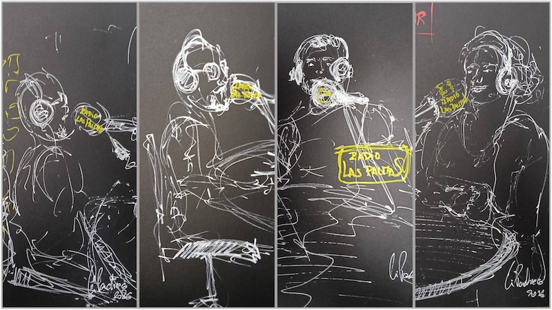 Dibujos realizados en directo durante la entrevista a Inés Pacheco en La Ruta de la Seda, una muestra de su dominio de la pintura rápida y de su capacidad para captar el instante desde el gesto y la emoción.