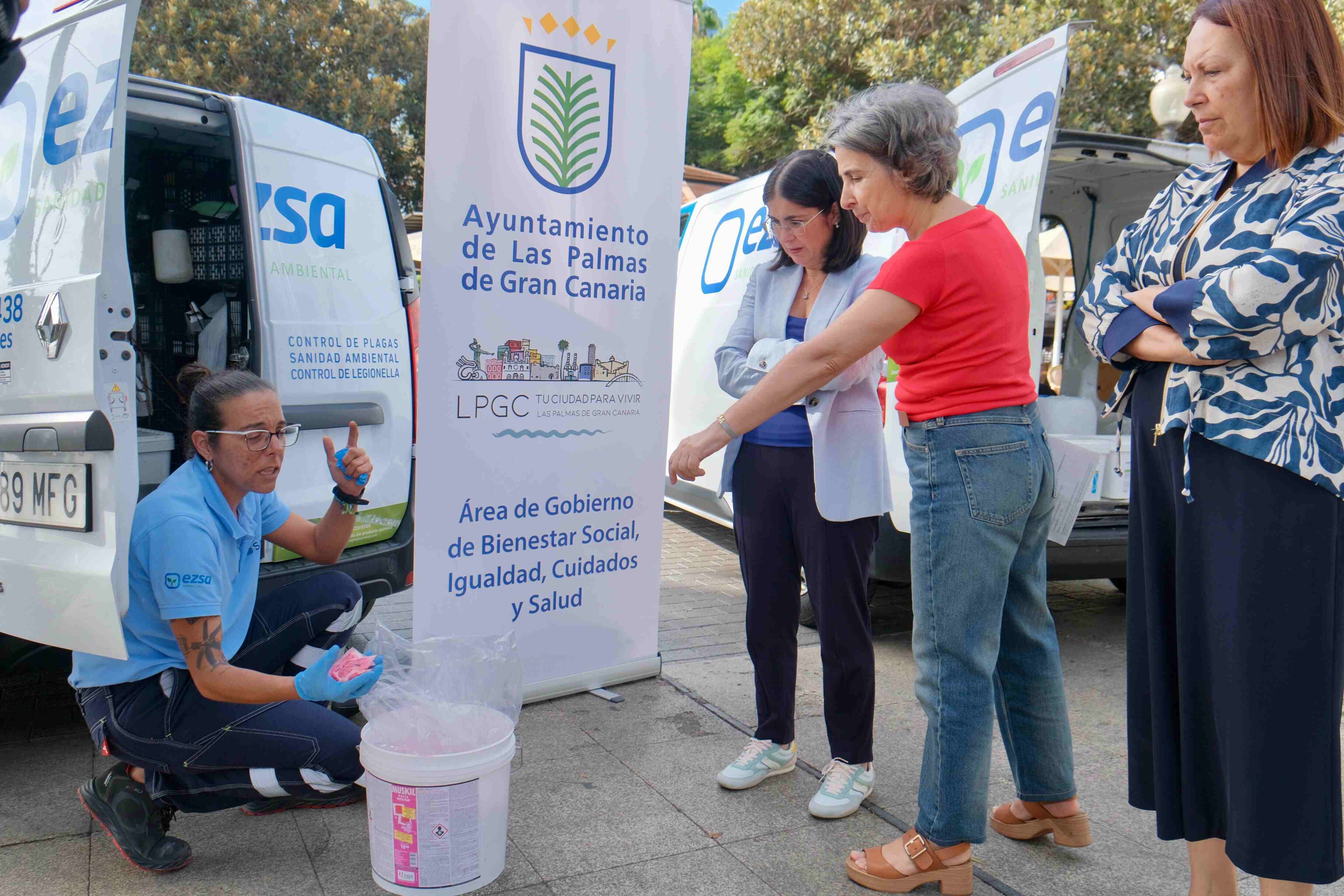 La alcaldesa de Las Palmas de Gran Canaria, Carolina Darias, y la concejala de Salud Pública, Carmen Luz Vargas, han presentado este viernes, en el Parque Santa Catalina, el nuevo contrato municipal de control de plagas, que refuerza significativamente este servicio en toda la ciudad.