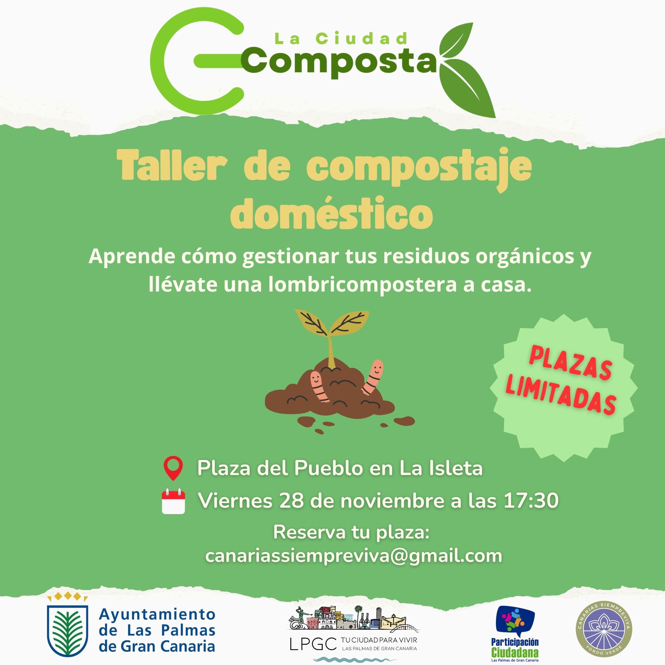 El programa de actividades, que ha arrancado esta semana, continuará este viernes, 28 de noviembre, con un Taller de Compostaje Doméstico en la Plaza del Pueblo de La Isleta, a las 17:30 horas. Las personas asistentes aprenderán qué residuos pueden transformarse en compost, cómo mantener una lombricompostera en buen estado y diversas pautas para garantizar su correcto funcionamiento. Al finalizar la sesión, quienes participen podrán llevarse una lombricompostera doméstica para iniciar su propio proceso en el hogar.