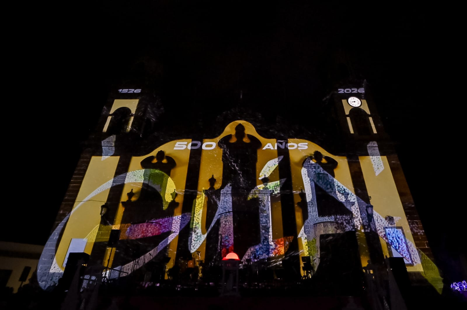 La noche festiva comenzó con un espectáculo visual y sonoro que transformó por completo el frontis del templo matriz y lo convirtió en un lienzo vivo. La proyección llevó al público por un viaje inmersivo a lo largo de los 500 años de historia de la Ciudad, con un recorrido por las raíces que han dado forma a Guía, por su cultura, sus oficios, sus tradiciones y el valioso patrimonio histórico, artístico y social que define su identidad.