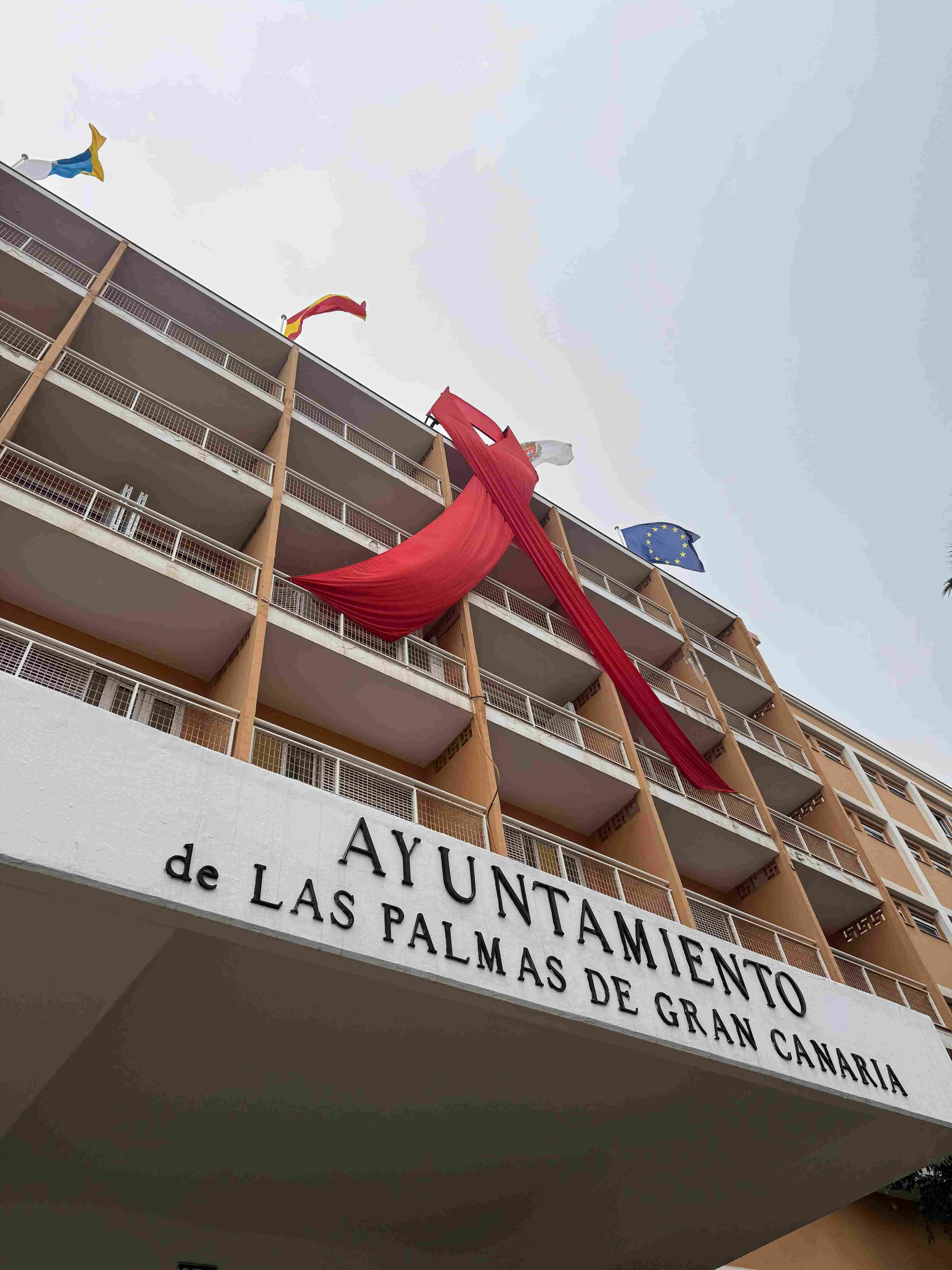 El Ayuntamiento de Las Palmas de Gran Canaria ha desplegado un gran lazo rojo en la fachada de las Oficinas Municipales con motivo de la conmemoración este lunes, 1 de diciembre, del Día Mundial Contra el Sida.