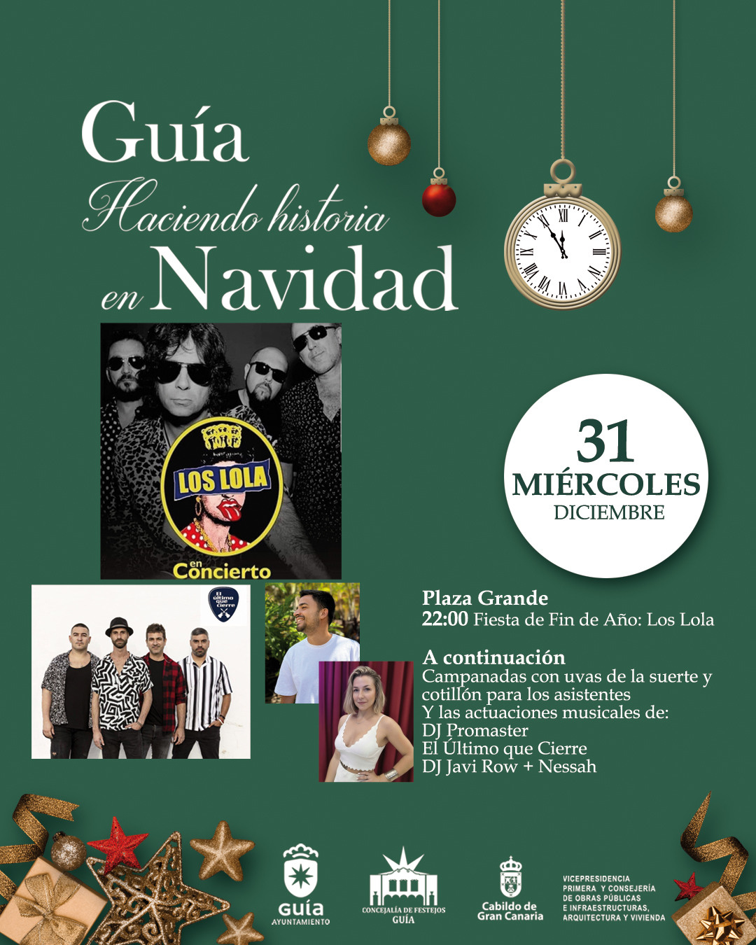 Guía tiene todo listo para dar la bienvenida al Nuevo Año 2026 por todo lo alto. La Plaza Grande de la ciudad será el escenario de la gran fiesta de Fin de Año que se celebrará este miércoles, una cita que arrancará a las 22:00 horas con la actuación del grupo Los Lola. Será una noche festiva marcada por la buena música y el gran ambiente, donde no faltarán las uvas y el cotillón, que se repartirán para que vecinos y visitantes puedan recibir el nuevo año de manera festiva y compartida, siguiendo las campanadas del reloj de la Iglesia de Santa María de Guía, uno de los momentos más esperados de la noche.
