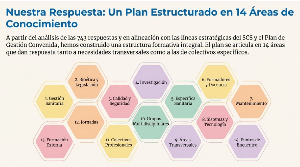 El Plan de Formación Continuada se estructura en varias áreas de conocimiento, que abarcan desde la gestión y planificación sanitaria hasta la investigación, la calidad y seguridad del paciente, la tecnología, las áreas transversales y la formación sanitaria específica, esta última concentrando el mayor número de cursos.