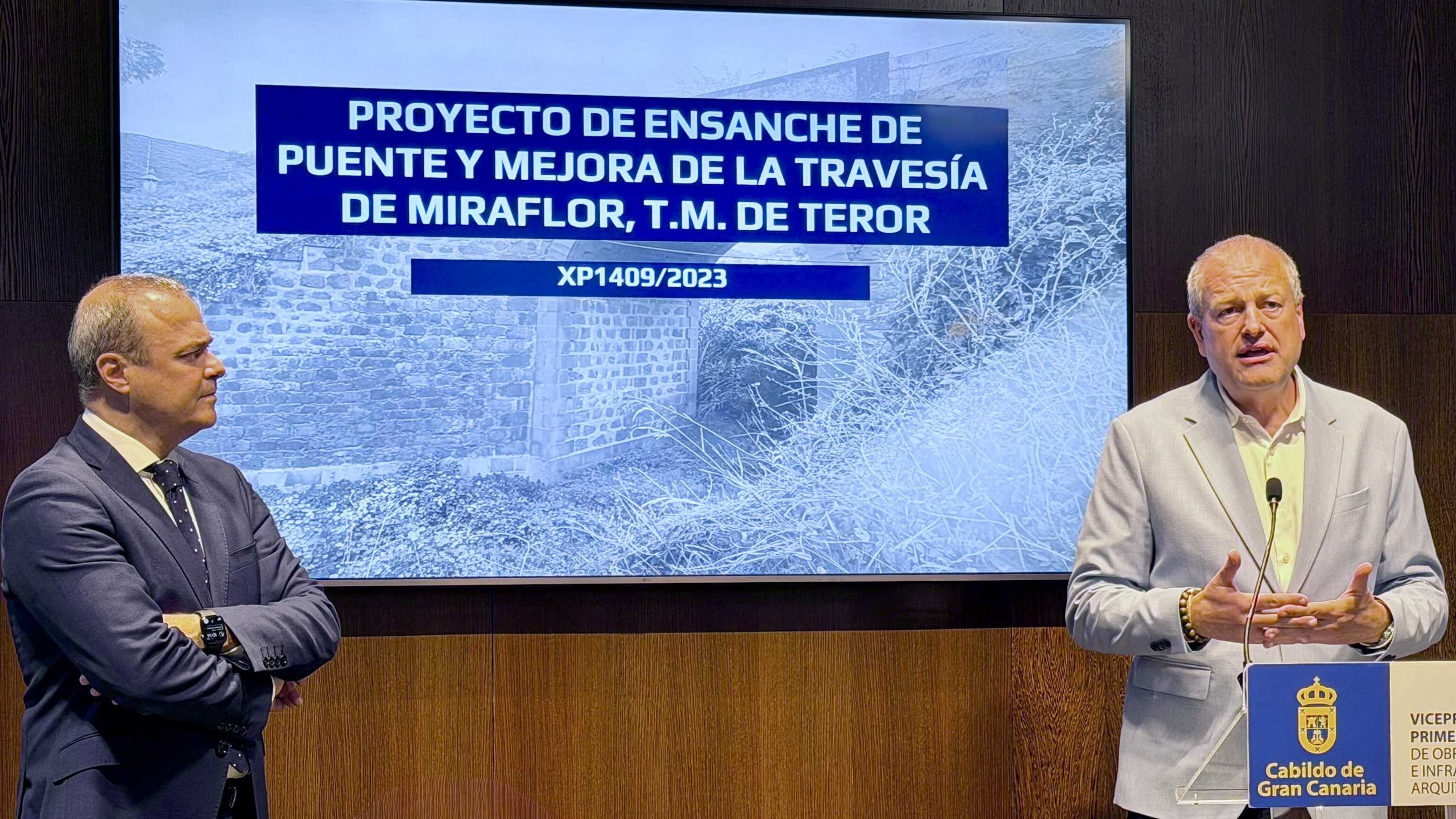 La Consejería de Obras Públicas e Infraestructura, Arquitectura y Vivienda, dirigida por Augusto Hidalgo, ha culminado el denominado Proyecto de ensanche de puente y mejora de la travesía de Miraflor en la GC-21, un plan acordado con el Ayuntamiento de Teror para acabar con el cuello de botella que supone el puente centenario sobre el que pasa la carretera de Teror, y eliminar también los problemas de seguridad en el tráfico y en los peatones de esta travesía. Augusto Hidalgo y el alcalde de Teror, José Agustín Arencibia, han presentado esta mañana los detalles de un proyecto que también será presentado esta misma tarde a los vecinos de este barrio de la Villa Mariana.