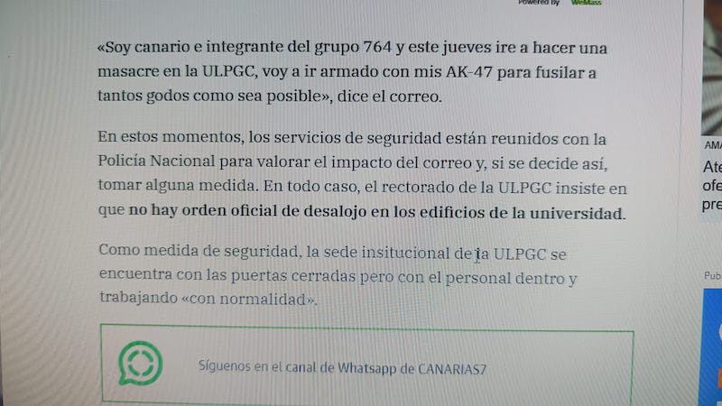 La Universidad de Las Palmas de Gran Canaria informó este jueves de que las Fuerzas y Cuerpos de Seguridad del Estado investigan una amenaza recibida por correo electrónico, un mensaje considerado sospechoso y que ha activado el protocolo interno de prevención. La institución académica mantiene contacto directo con la Delegación del Gobierno para evaluar las medidas más adecuadas, según el comunicado remitido por la Gerencia.